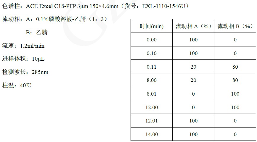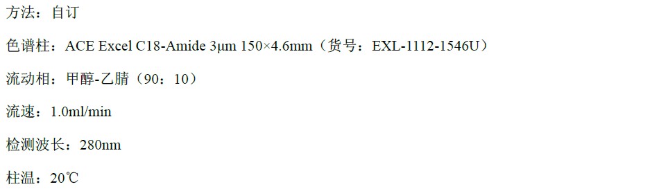 國(guó)標(biāo)中用的是C30柱,水/甲醇的流動(dòng)相體系,30 min的梯度方法,我們使用ACE C18-PFP,用磷酸溶液/乙腈體系,14 min的梯度方法就可以實(shí)現(xiàn)目標(biāo)成分的分離,總體更節(jié)約分析時(shí)間。