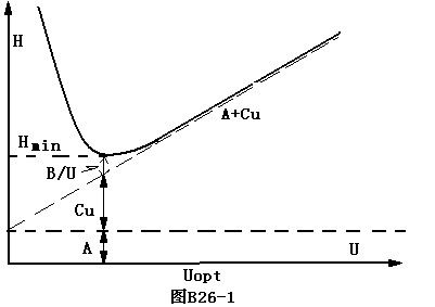 圖B26-1 為H-u曲線,曲線上Hmin對應最佳線速度Uopt,根據(jù)柱長L與塔板高度H的關系,理論塔板數(shù)n=L/H,在給定條件下,若在最佳流速下進行操作,可獲得最高柱效。在曲線的最低點,塔板高度H最小(H最?。?。