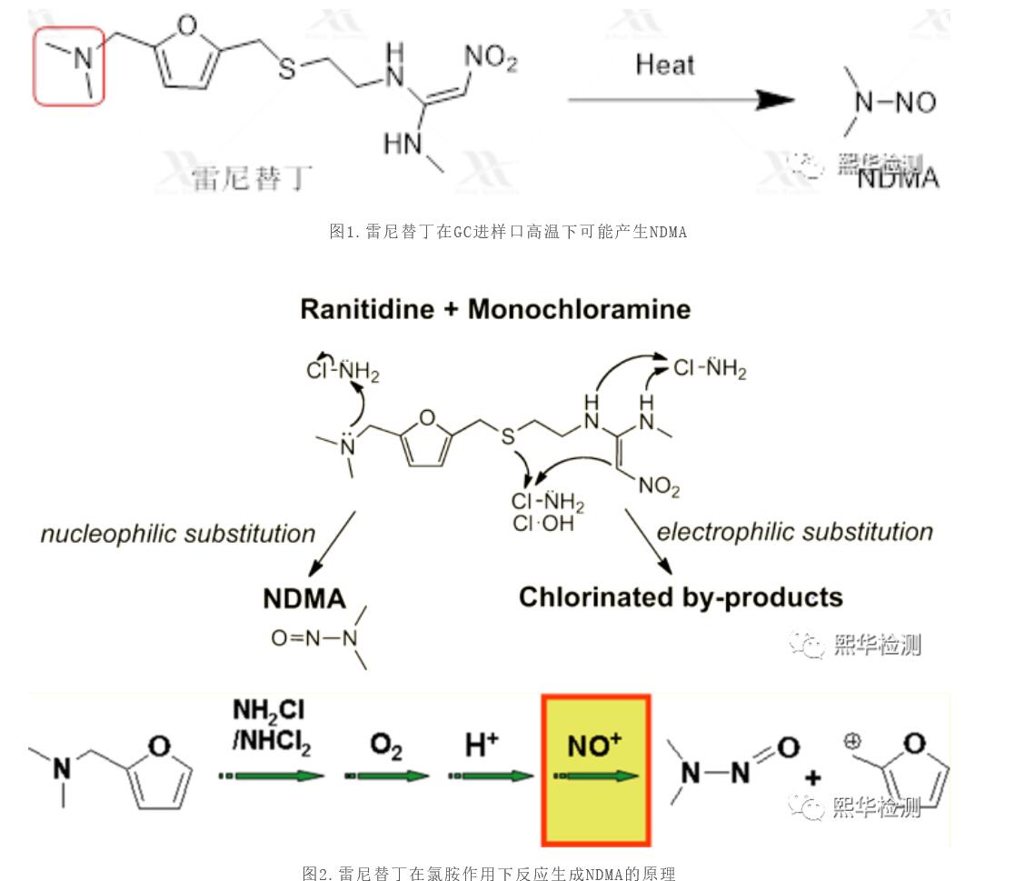 值得注意的是,有報道稱雷尼替丁在使用HS-GC-MS/MS方法檢測的時候,會出現(xiàn)假陽性結(jié)果。有研究表明,該結(jié)果是因為部分雷尼替丁樣品在GC進樣口的高溫環(huán)境下降解產(chǎn)生NDMA導致(圖1)。也許是冥冥之中早有定數(shù),雷尼替丁作為一個普通的組胺H2受體阻斷劑,早在2012年【1】和2014年【2】就被當作模型化合物用于研究三級胺的亞硝酸化反應(圖2)。上述文獻顯示,雷尼替丁在氧化劑的作用下(NH2Cl,注意不是氯化銨,該化合物是一種消毒劑)作用下,能夠通過一系列復雜的分子內(nèi)反應生成NDMA。