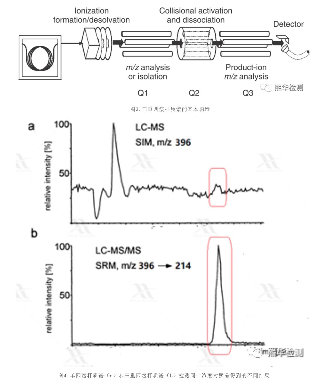說到定量,毫無疑問,還是應該請我們分析定量界的王者-三重四極桿質(zhì)譜上場。雖然屬于低分辯質(zhì)譜,但由于其獨特的結(jié)構(gòu)設計(圖3),通過Q1篩選母離子,Q3篩選碎片離子來濾過干擾,大大降低了噪音信號,提高了分析靈敏度(圖4)。