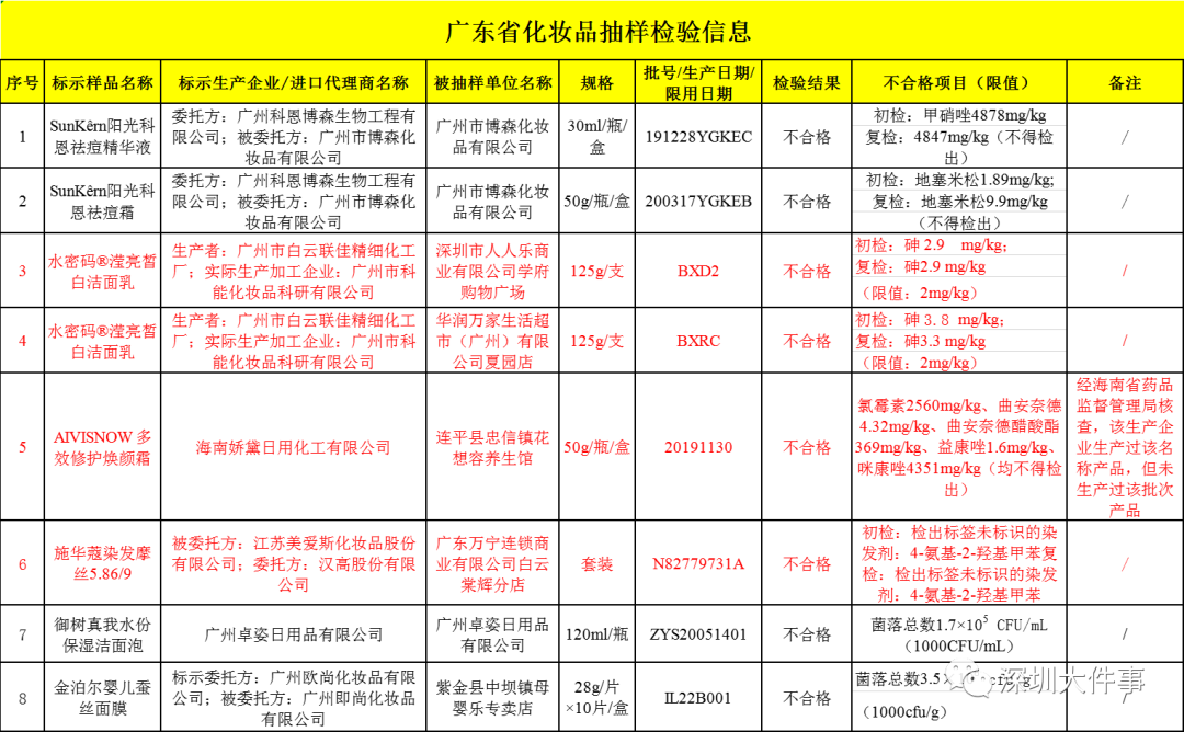 華潤萬家生活超市(廣州)有限公司夏園店銷售的、廣州市科能化妝品科研有限公司生產(chǎn)的水密碼 瀅亮皙白潔面乳,初檢砷含量為3.8 mg/kg,復(fù)檢砷含量為3.3 mg/kg。
