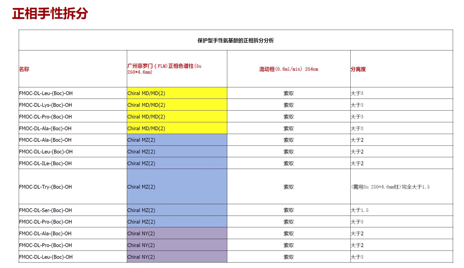 保護型的各類氨基酸,全部可以在某種多糖型手性柱中實現(xiàn)手性拆分。推薦的一套