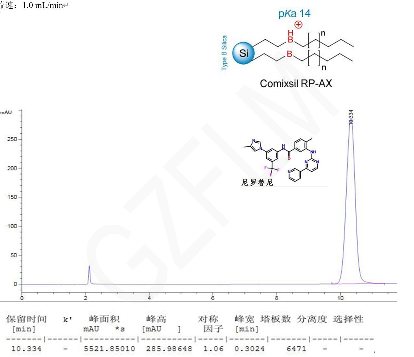 方法說明:尼羅替尼具有多個堿性基團,在 C18 柱上會出現(xiàn)明顯拖尾效應(yīng);而使用 Comixsil RP-AX 是陰離子交換+疏水混合模式,對化合物上堿性基團是排斥作用,可以達(dá)到改善峰型的效果。