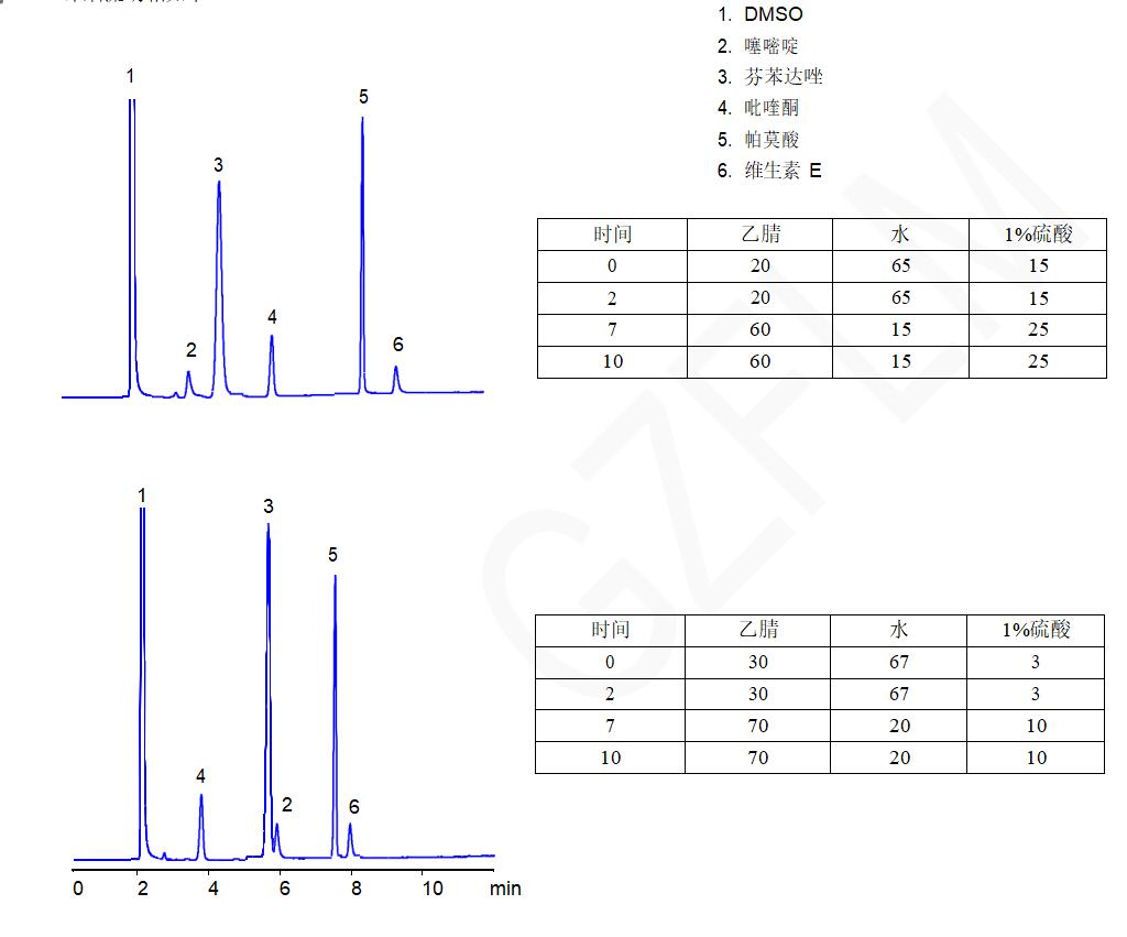 App ID: FLM-C240009 Comixsil ACRP 同時(shí)分析獸藥噻嘧啶、芬苯達(dá)、唑吡喹酮等 方法:自定 色譜柱:Comixsil ACRP 3u 150×4.6 mm(貨號(hào):FMF-ACRP3-EONU) 流速:1.0 mL/min 檢測器:215nm 詳細(xì)流動(dòng)相如下: ![]() |