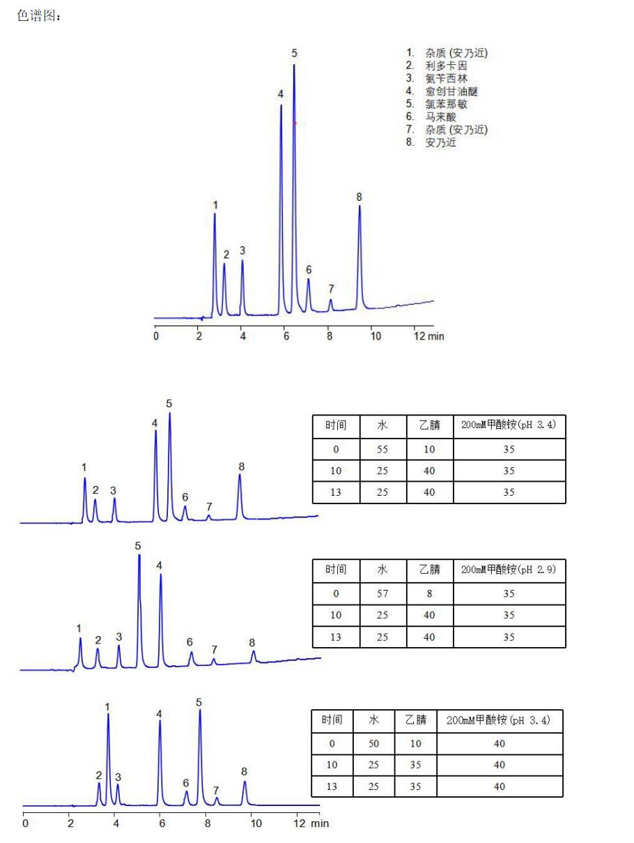 App ID: FLM-C240008 Comixsil RP-AX 同時(shí)分析鎮(zhèn)痛類藥物制劑安乃近、利多卡因、愈創(chuàng)甘油醚、馬來酸氯苯那敏、氨芐西林 色譜柱: Comixsil RP-AX 3μm 150*4.6mm(貨號(hào):FMF-AXR3-EONU) 流動(dòng)相: 時(shí)間 水 乙腈 200mM 甲酸銨(pH 3.4) 0 55 10 35 10 25 40 35 10.01 55 10 35 20 55 10 35 流速:1.0 mL/min 檢測(cè)波長(zhǎng):255nm 柱溫:25℃ 樣品濃度:N/A 進(jìn)樣量:N/A 結(jié)構(gòu)式:
