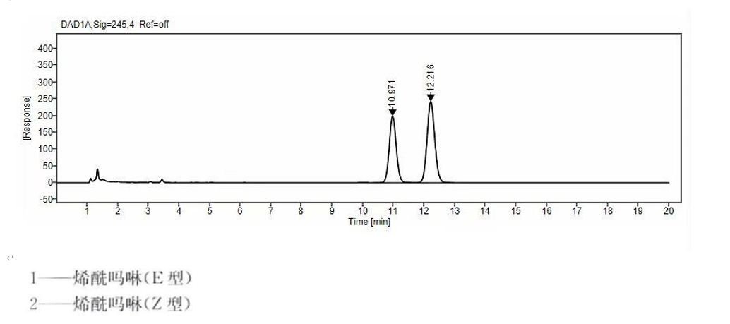 烯酰嗎啉: 流動相:乙腈:0.1%磷酸水=40:60 波長:254nm 色譜圖: