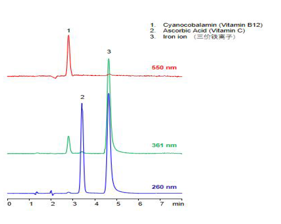 App ID: FLM-C250009 Comixsil HAX 對保健品配方中維生素C、維生素B12 以及硫酸亞鐵的HPLC-UV 法測定 色譜柱:Comixsil HAX 3u 150*2.1mm (貨號:FMF-HAX3-BONU) 方法:100ml 乙腈+600ml 水+300ml 100mM 甲酸銨(pH4.1) 流速:0.2 mL/min 檢測:260nm、360nm 和550nm 樣品濃度:維生素B12 0.005 mg/mL、維生素C 0.1mg/mL、三價(jià)鐵離子0.05mg/mL、EDTA 0.15mg/mL 進(jìn)樣量:1 μL