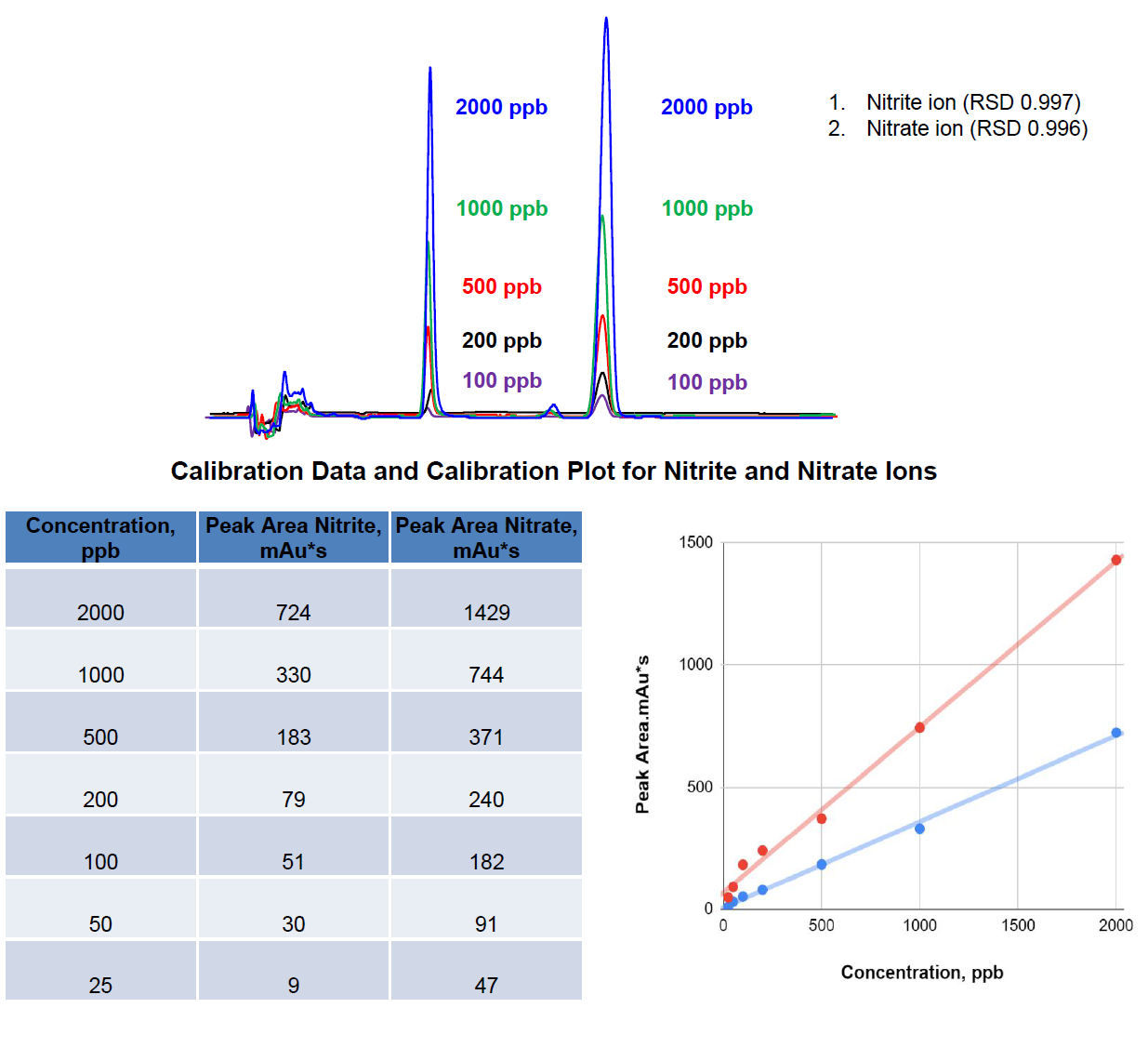 方法說明:某藥物中亞硝酸根與硝酸根殘留量的檢測。我們獲準(zhǔn)公布與分享這兩個離子的線性數(shù)據(jù)。 Comixsil HAX是陰離子交換+Hilic的混合模式色譜柱。此案例中將進(jìn)樣量提升至100ul將再升LOD/LOQ 。ACN可以用于去除分析中其它非離子的不希望要的化合物的干擾(Hilic下不保留)。同時如果樣品中有其它堿性化合物,基于陽離子排阻,將很快洗脫出峰不干擾。 |