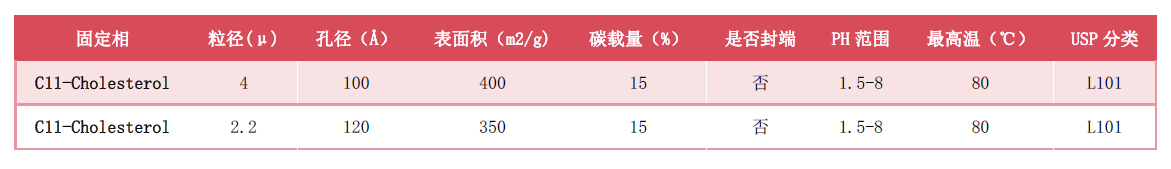 C11-Cholesterol固定相極其穩定性。此固定相的選擇性,適合非常多的化合物,特別是低溫條件下,可依據分子形狀結構的不同分離化合物。