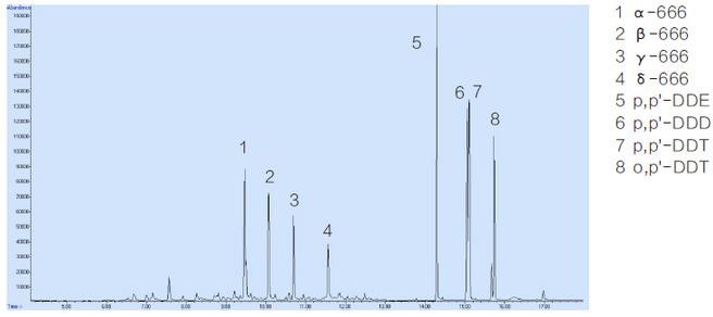 八種農(nóng)殘標準品:α-666(CAS: 319-84-6),β-666(CAS: 319-85-7),γ-666(CAS: 58-89-9), δ-666(CAS: 319-86-8),p,p'-DDE(CAS:72-55-9),p,p'-DDD(CAS:72-54-8),