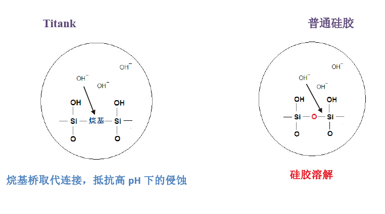 Titank 系列有機(jī)硅膠雜化基質(zhì),是在硅膠的硅氧烷網(wǎng)狀構(gòu)造中以更加穩(wěn)定的烷基來(lái)取代在堿性條件下不穩(wěn)定的硅氧橋連接,使其既具有硅膠類(lèi)填料的良好分離性能和機(jī)械強(qiáng)度,又有聚合物填料的耐堿性。