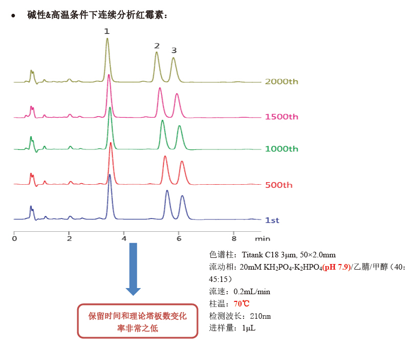 例如紅霉素,它在酸性條件下極易分解,并且需要高溫來(lái)維持良好的峰形,普通硅膠基質(zhì)色譜柱是難以耐受這種分析環(huán)境,這時(shí),就需要 Titank系列有機(jī)硅膠雜化色譜柱來(lái)解決上述分析難題。